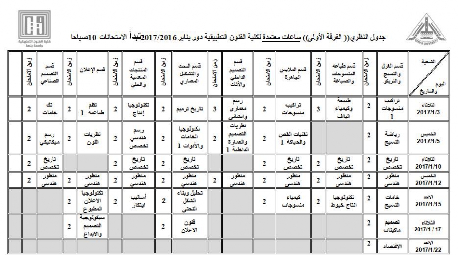 جدول الامتحانات النظرية للفرقة الاولى (المستوى الثانى - الفصل الدراسى الثالث) للترم الاول للعام الدراسى 2016/2017