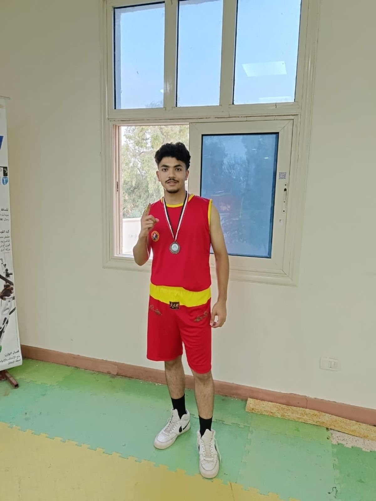 الطالب / مهاب أشرف عبدالمحسن الطالب بالفرقه الثانيه برنامج علوم تصميم وانتاج الاثاث لحصوله على الميدالية البرونزية في رياضة الملاكمة على مستوى جامعة بنها.