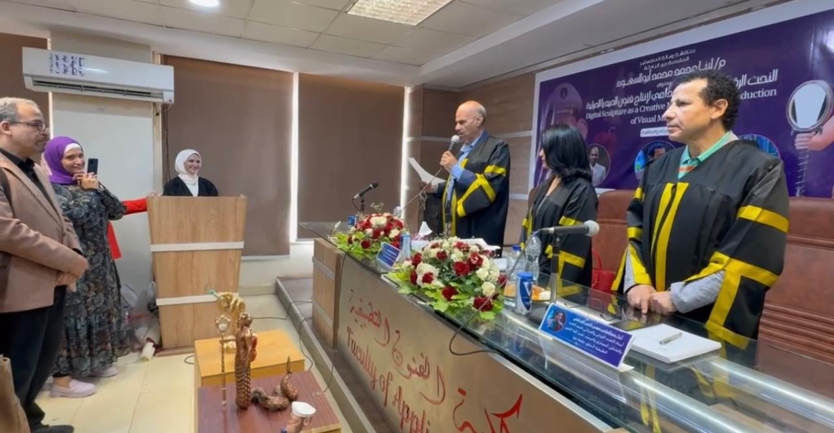 يهنئ السيد د/ صبحي حسين شعلان , قائم بعمل رئيس قسم النحت والتشكيل المعماري والترميم والساده أعضاء هيئة التدريس والهيئة المعاونة بالقسم المعيدة/ لينا محمد محمد أبو السعود المعيدة بقسم النحت والتشكيل المعماري والترميم, وذلك لمناقشة رسالة الماجستير بتاريخ 9/7/2025 تحت عنوان ( النحت الرقمي كوسيط إبداعي لإنتاج فنون الميديا المرئية ) ,