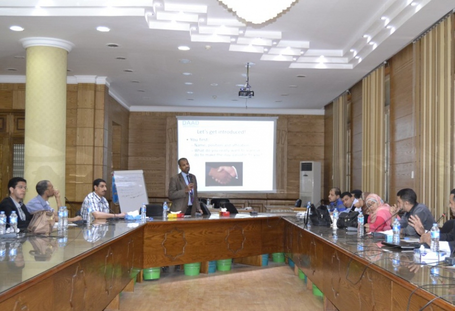فى إطار سعى الجامعة لرفع قدرات السادة أعضاء هيئة التدريس ومعاونيهم فى الكليات المختلفة بالتعاون مع الهيئة الالمانية للتبادل الثقافى ( (DAADتم تنظيم ورشة عمل عن "كيفية كتابة مقترح المشروع البحثى التنافسى" و قد تم اختيار 26 عضو هيئة تدريس ومعاونيهم من قبل الهيئة بناء على تقدمهم من خلال موقع الهيئة الالكترونى وفقا للمعايير المعلنة مسبقا وذلك من كليات الزراعة والطب والطب البيطرى والهندسة والاداب والحاسبات والمعلومات وسوف تعقد الورشة بقاعة مجلس الجامعة يوم الاثنين الموافق 2015/05/04 بمبنى ادارة الجامعة من الساعة التاسعة صباحا وحتى الرابعة عصراً وسوف يحاضر بها الاستاذ الدكتور/ جلال حسن جلال الدين - استاذ هندسة نظم المعلومات بجامعة القاهرة والمدرب المعتمد من الهيئة.