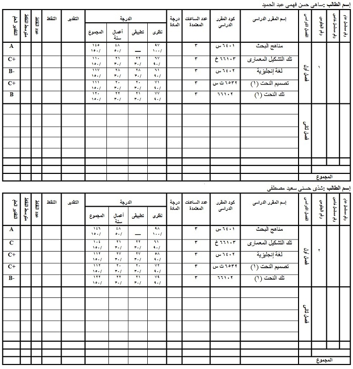 نتيجة الدراسات العليا لمرحلة تمهيدى ماجستير ترم أول قسم النحت والتشكيل المعمارى للعام 2014/2015م مميز