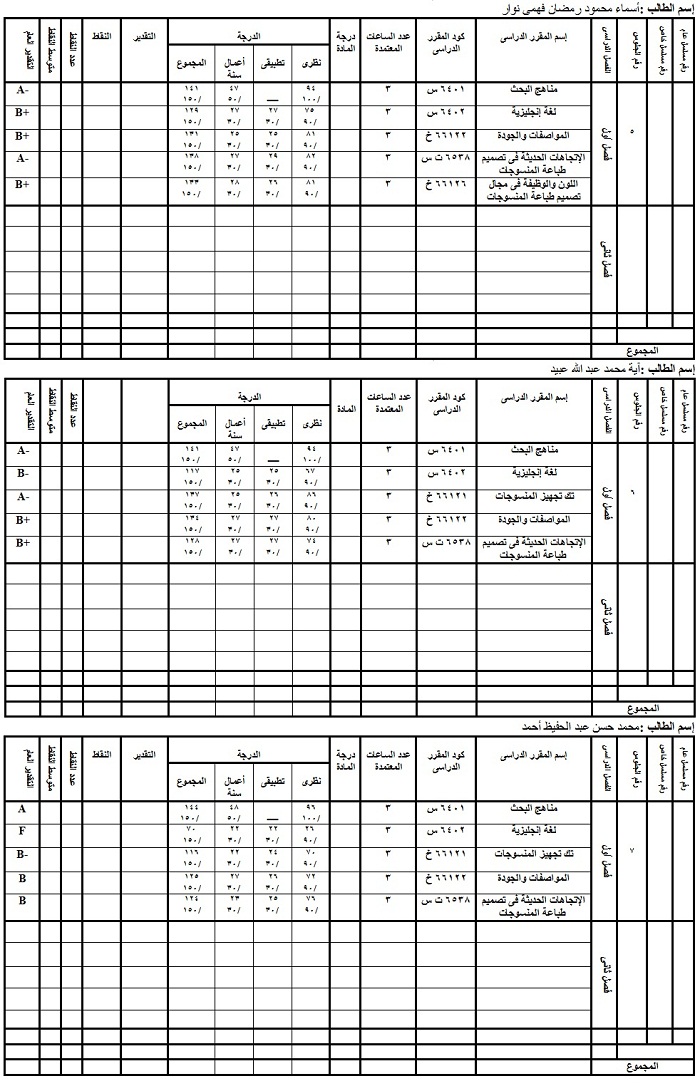 نتيجة الدراسات العليا لمرحلة تمهيدى ماجستير ترم أول قسم طباعة المنسوجات والصباغة والتجهيز للعام 2014/2015 م مميز