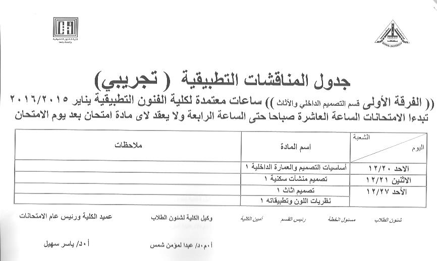 جدول المناقشات التطبيقية (تجريبى) الفرقة الأولى قسم التصميم الداخلى والأثاث مميز