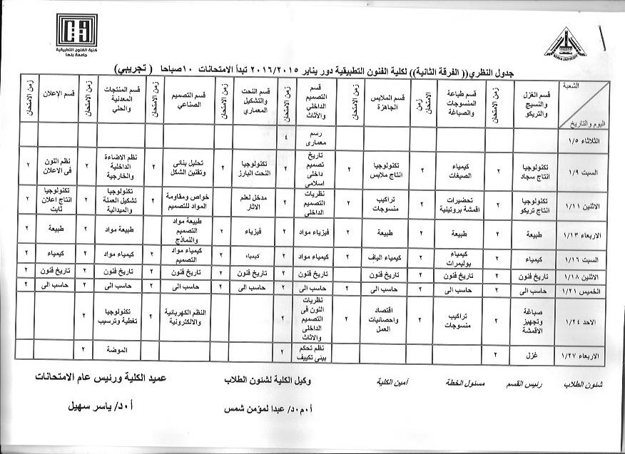جدول النظري للفرقة الثانية لكلية الفنون التطبيقية دور يناير 2015-2016 (تجريبى) مميز