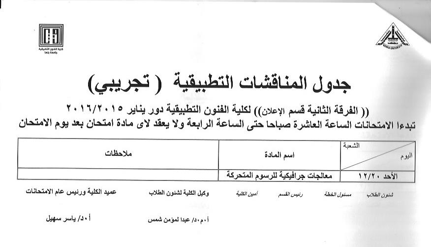 جدول المناقشات التطبيقية (تجريبى) الفرقة الثانية قسم إعلان مميز