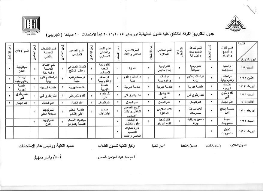 جدول النظري الفرقة الثالثة لكلية الفنون التطبيقية 2015-2016