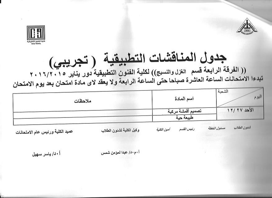 جدول المناقشات التطبيقية(تجريبى) الفرقة الرابعة قسم الغزل والنسيج مميز