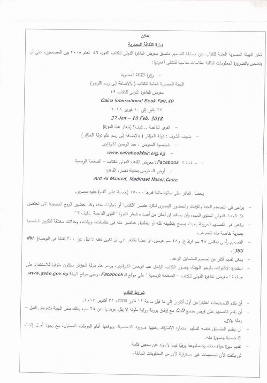 أعلنت الهيئة المصرية العامة للكتاب، إحدى الهيئات التابعة لوزارة الثقافة، فتح باب التقدم لمسابقة تصميم بوستر معرض القاهرة الدولى للكتاب في دورته ال49، مشيرة إلي أن قبول التصميمات سيتمر حتى الساعة الثانية عشر من ظهر يوم 31 أكتوبر الجاري.
