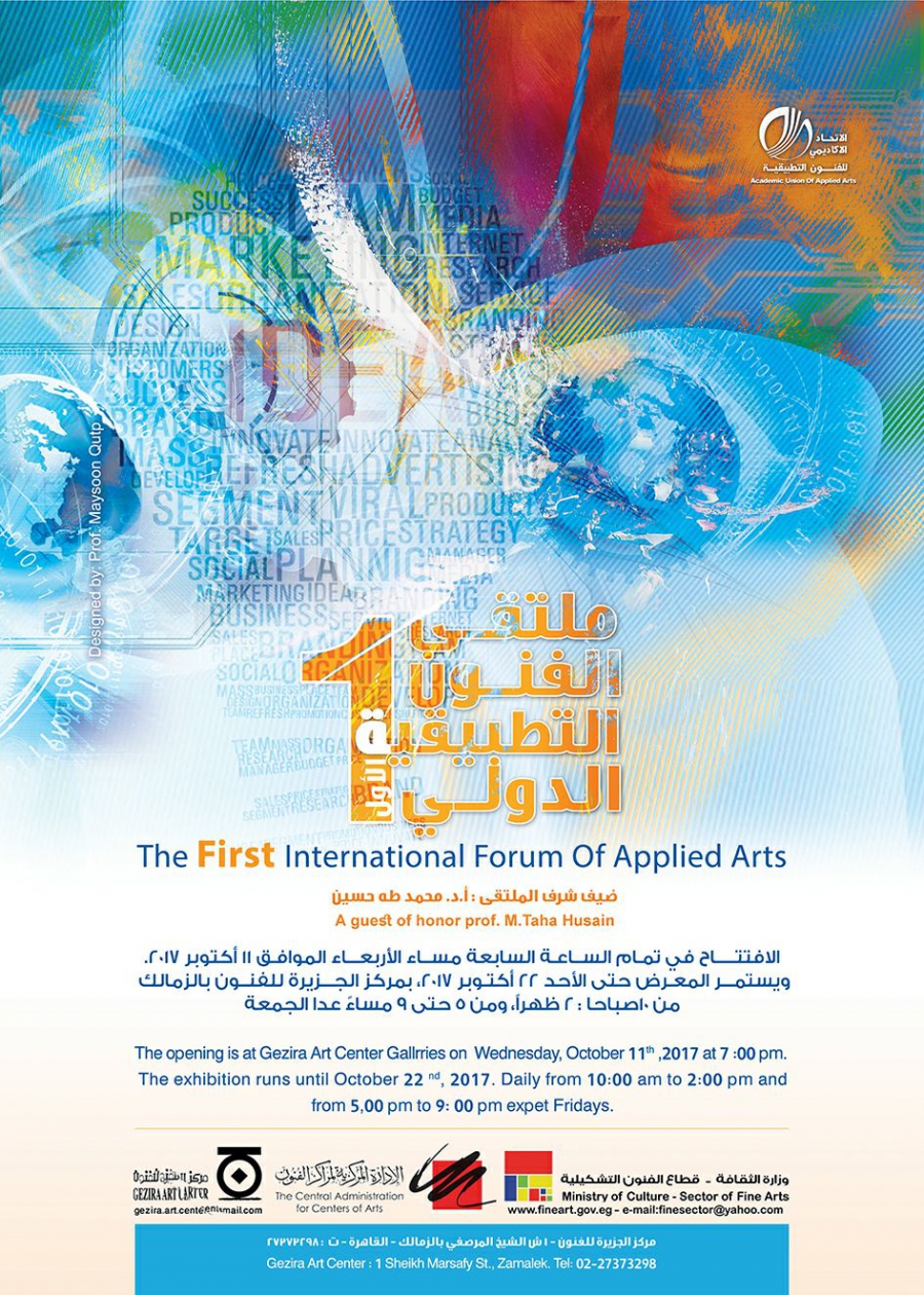 دعوة للجميع لحضور ملتقى الفنون التطبيقيه الدولي الاول بمركز الجزيرة للفنون بالزمالك والافتتاح الاربعاء 11 اكتوبر 2017 الساعة ٧ مساء وضيف شرف الملتقى أ.د محمد طه حسين ، ويستمر المعرض حتى الاحد 22 اكتوبر 2017 ...