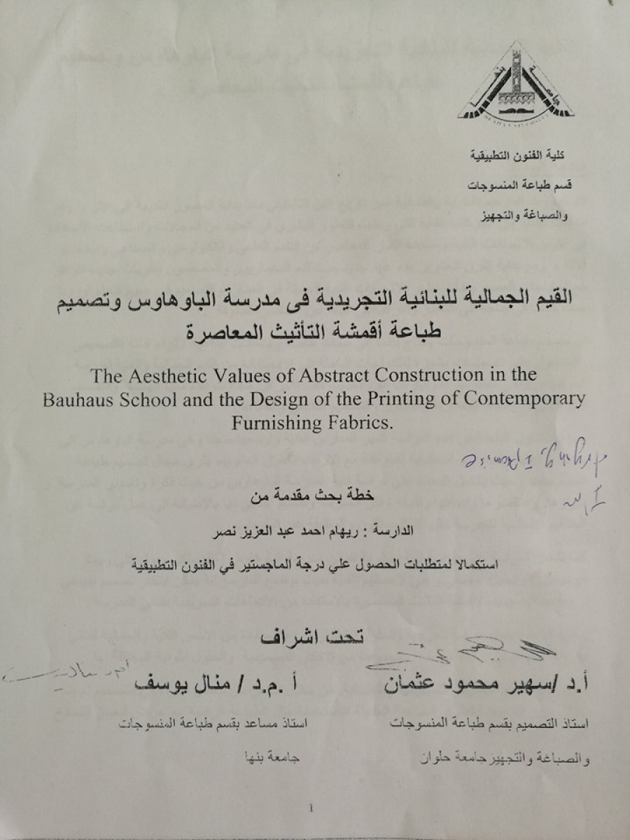 هيئة الاشراف للبحث الاستاذ الدكتور / سهير محمود عثمان استاذ التصميم بقسم طباعة المنسوجات والصباغة والتجهيز بكلية الفنون التطبيقية ، جامعة حلوان / ووكيل سابق لخدمة شئون البيئة وتنمية المجتمع ، والدكتورة / منال يوسف نجيب الاستاذ المساعد بقسم طباعة المنسوجات والصباغة والتجهيز بكلية الفنون التطبيقية ، جامعة بنها . بالتوفيق
