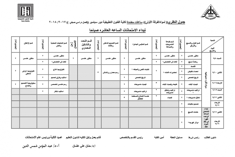 جدول الترم الصيفى للفرقة الاولى للعام الدراسى 2017-2018